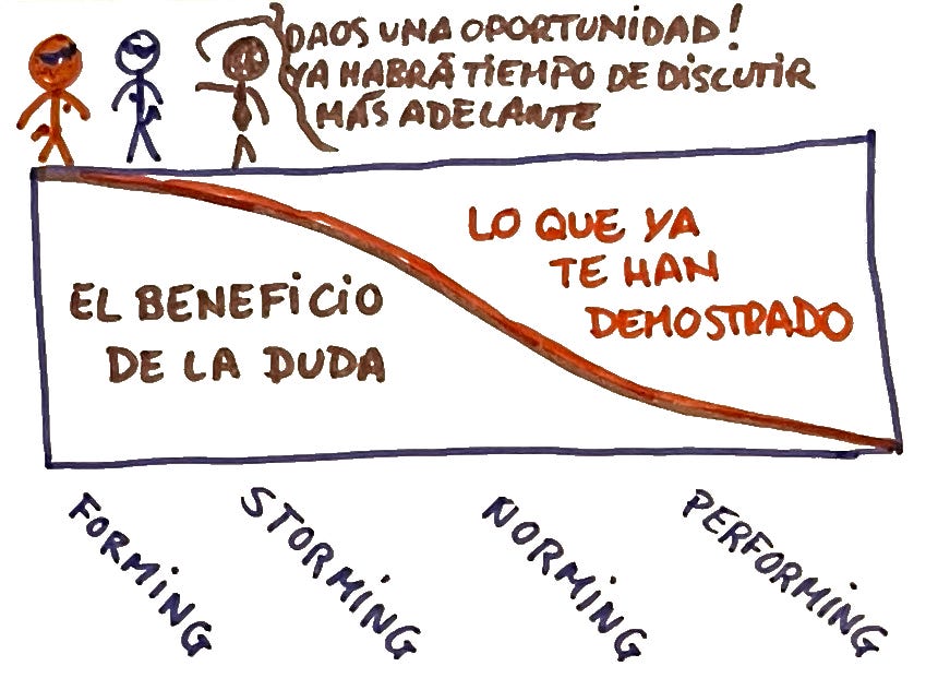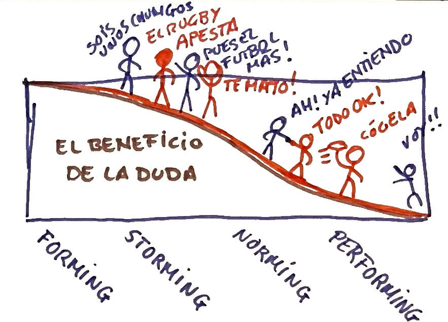 Es el Forming (presentaciones), storming (discusiones y retos), norming (establecimiento de reglas claras y comunes) y, finalmente, performing (el equipo rindiendo genial).